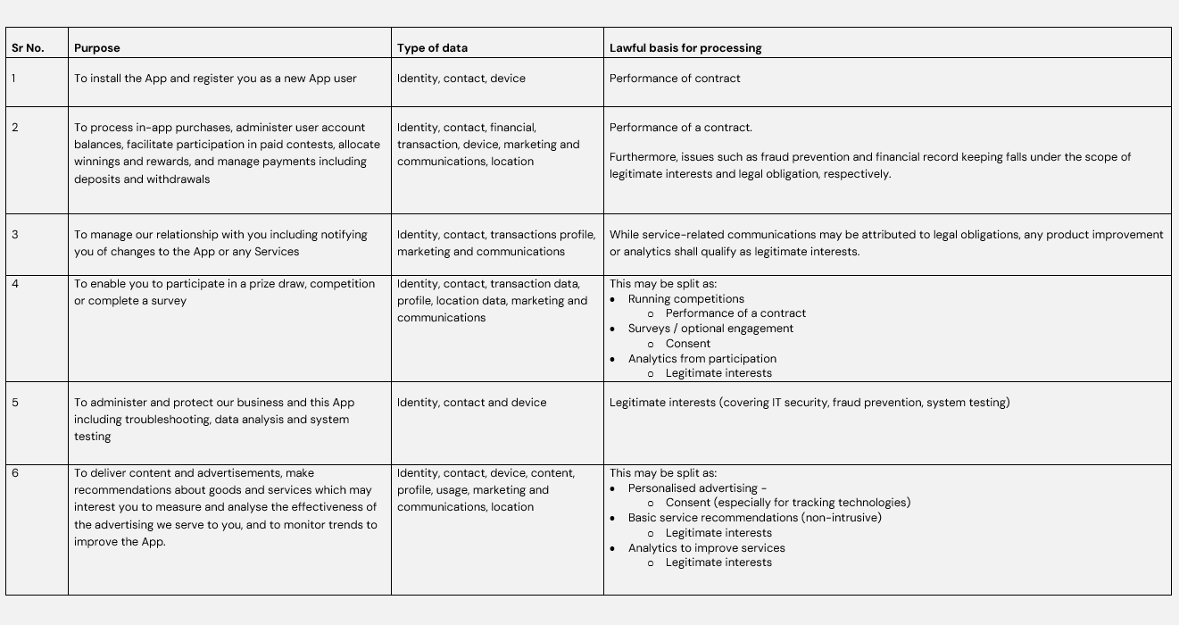 We may collect, use, store and transfer different kinds of personal data about you, including, identity data, contact data,financial data, transaction data, device data, content data, profile data,usage data, gameplay and account data, and marketing and communications data and location data. We may collect data relating to your use of the platform,including gameplay activity, scores, contest participation, rankings, and winnings.We also process data relating to in-app account balances and user wallet activity. This includes records of deposits made by users, participation in paid contests, entry fees, winnings, rewards, bonuses,withdrawals, and any other credits or debits associated with a user’s account on the platform. Such data forms part of transaction data and gameplay/account data and is used to operate and administer user accounts, facilitate gameplay,manage balances, process payments, detect fraud, and comply with legal and regulatory obligations.Identity data includes government-issued identification documents, photographs/selfies, and related information, for the purposes of account verification, age verification, fraud prevention, and compliance with legal and regulatory obligations. Financial data includes payment method details (processed via secure third-party providers), user account balance information, and transaction records (including deposits,contest entry fees, winnings, rewards, and withdrawals), together with related billing information. We use this data to process payments, manage user balances, prevent fraud, and comply with legal obligations.We also collect, use and share statistical and demographic data for for analytics, service improvement, and business insights.It could be derived from your personal data but is not considered personal data as it will not directly or indirectly reveal your identity. The usage data is used to calculate the percentage of users accessing a specific App feature.However, if we combine or connect aggregated data with your personal data so that it can directly or indirectly identify you, we treat the combined data as personal data which will be used in accordance with this privacy policy.We do not intentionally collect special categories of personal data. Where identity verification involves photographs or similar data, such data is processed by third-party providers for verification and compliance purposes.